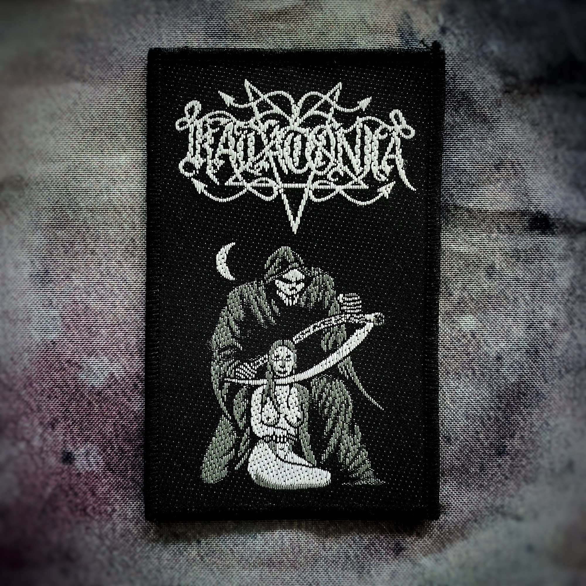 Woven patch with black paper backing.
